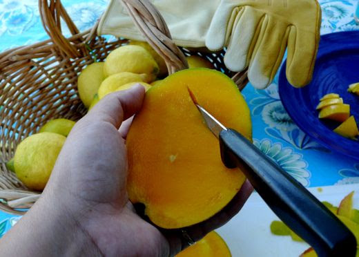 Carefully, using a small knife, I score the fruit right down to the inside of the skin, then I go back across diagonally.