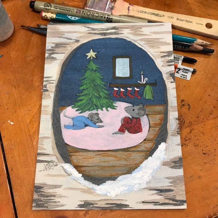 I am sure you see flaws the rest of us do not notice. It's always that way for the one who creates! I've been wondering if you were illustrating a Christmas story or something. Your little mice have a certain charm all their own. I like your paintings.