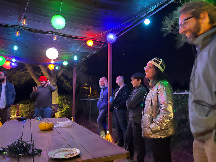 We shared a lovely first evening of the New Year. Gordon and Molly joined us, and so did Matt A, and Leslie and Ido. And Leo, out training for track, dropped in for a quick bite and visit. We saw stars, heard owls. Bex shared her new sticker making craft, which is a really fun and easy craft. Alex brought out the Tesla coil he got for Christmas, which is a really neat display on a cold winter night. And we ate, of course. All of the beans, and most of the chicken, all of the vegan dish, and Maria and I were very much thrilled that a few tortillas were leftover, because yum!